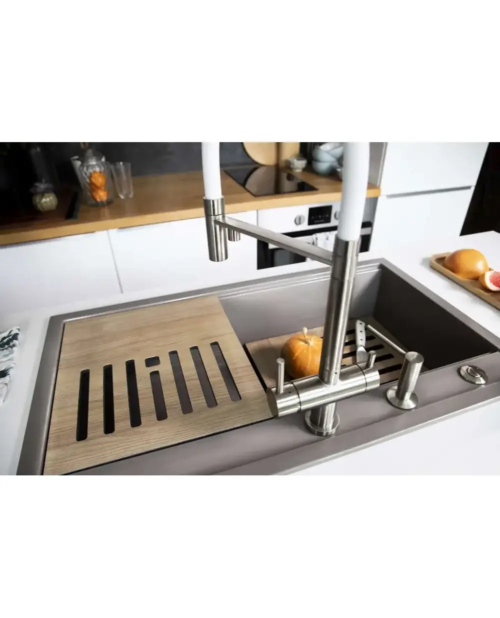 • Гармоничное сочетание мойки, смесителя и разделочной доски идеально дополняют друг друга.