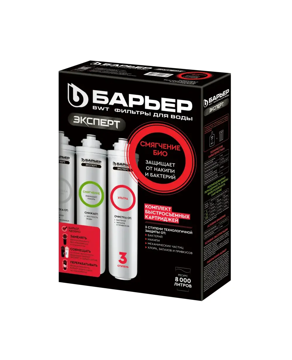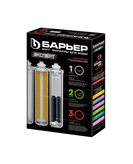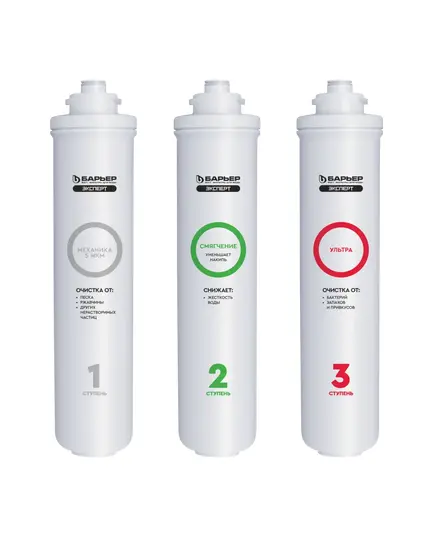 | Сменные картриджи БАРЬЕР ЭКСПЕРТ Смягчение БИО эффективно умягчают воду и дополнительно защищают от бактериального загрязнения до 99,9%. Ультрафильтрационная мембрана толщиной 0,03 мкм улучшает вкусовые качества воды, не изменяя её минеральный состав. Производительность - 2 л/мин. Ресурс 8 000 литров. В комплект входит: 1. "БАРЬЕР ЭКСПЕРТ Механика" удаляет любые механические примеси размером от 5 мкм (песок, ржавчину и другие нерастворимые примеси). 2. "БАРЬЕР ЭКСПЕРТ Смягчение" предотвращает образование накипи. Эффективно снижает карбонатную жесткость, из-за которой образуется осадок в чайнике. Средний ресурс ступени по жесткости до 6 месяцев. 3. "БАРЬЕР ЭКСПЕРТ Ультра" - мембрана толщиной 0,03 мкм задерживает примеси и бактерии, но в отличие от обратноосмотической мембраны не обессоливает воду. |
