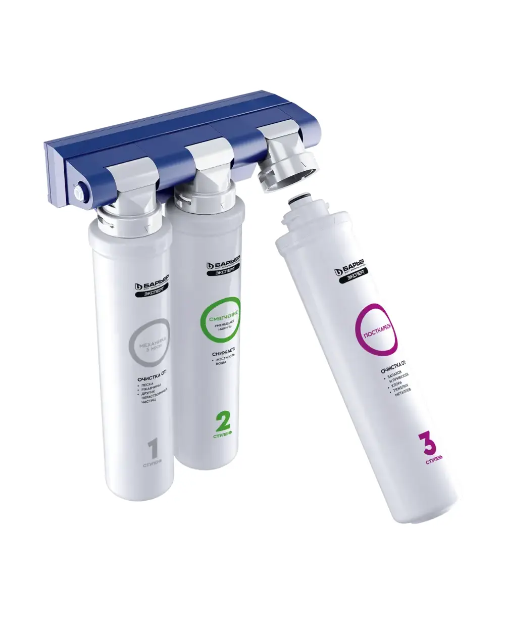 Обеспечивает комплексную очистку от солей жесткости и всех основных содержащихся в ней вредных примесей. Предотвращает образование накипи за счет удаления из состава воды солей жесткости. Картриджи всё так же можно менять одной рукой, теперь положение фильтрующих элементов статично. Комплектация без отдельного крана. Специально для смесителей 2 в 1. В комплекте переходник для подключения смесителя к фильтру 3/8-JG или 1/2-JG. Ресурс 10 000 литров