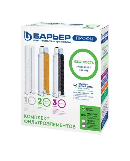 Картриджи стандарта SL 10. Позволяют забыть о накипи и получить вкусную безопасную воду. Производительность - 2 л/мин. В комплект входят картриджи: 1."БАРЬЕР ПРОФИ Механика 5 мкм" - удаление любых механических примесей до 5 мкм (песок, пластик, ржавчина, окалина и прочее). Ресурс 10 000 литров. 2."БАРЬЕР ПРОФИ Смягчение" - снижение карбонатной жесткости, из-за которой образуется накипь в чайнике. Ресурс по умягчению воды до полугода. Но картридж может быть подвергнут регенерации в домашних условиях с помощью простой поваренной НЕ йодированной соли не чаще 8 раз. 3."БАРЬЕР ПРОФИ Посткарбон" удаляет остаточный хлор и его побочные продукты, неприятные запахи и привкусы, кондиционирует воду. Ресурс 10 000 литров.