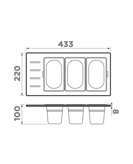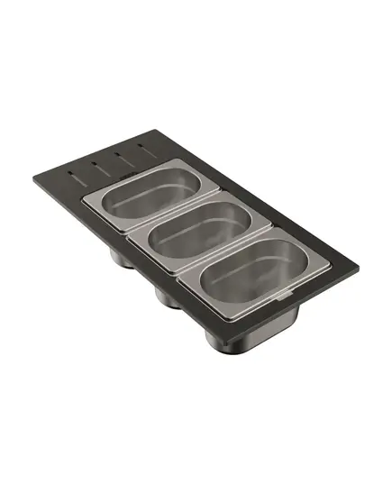 • Чаши свободно вынимаются из пластиковой подставки и перемещаются, а конструкция подставки разработана таким образом, чтобы ее можно было удобно разместить на внутренних ступенчатых направляющих моек: Sintesi 86, Sintesi 100 и Sintesi 116.