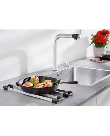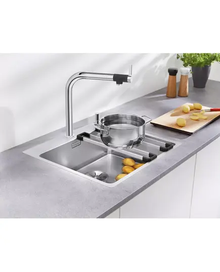 - Располагаемые на краях чаши держатели превращаются в мостик через мойку, позволяя работать на двух уровнях.