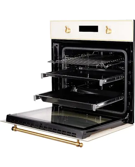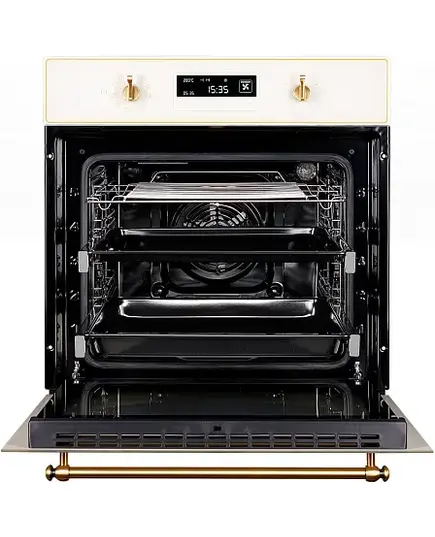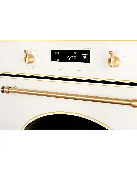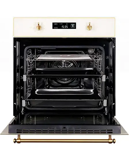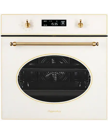 Духовой шкаф Kuppersberg SD 693 C BRONZE выполнен в нежном кремовом цвете и дополнен фурнитурой, окрашенной под алюминий. Прибор не только прекрасно дополнит кухню в любом стиле, но и подойдет по своим размерам даже для небольшого помещения. Обеспечивается это за счет компактных габаритов устройства — 59,5 на 59,5 при глубине 57,5 см и размере ниши встраивания в 59.5×56×56 см. Полезный объем в литрах — 66.