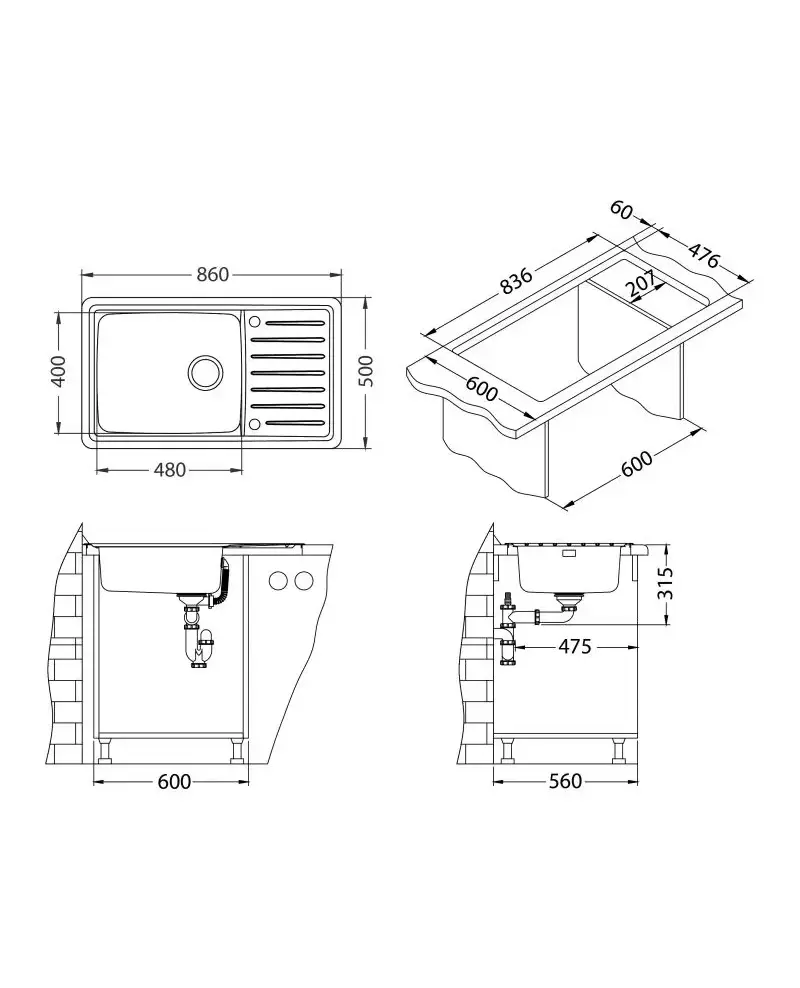 БрендAlveus МатериалНержавеющая сталь ЦветНержавеющая сталь Размер мойки,мм860х500 Размер чаши,мм480х400 Размер монтажной тумбы,см60 см Тип монтажаНакладной