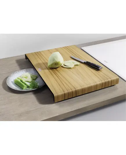 - Скользящая стеклянная разделочная доска или разделочный столик из ясеня позволяют сбрасывать нарезанные продукты непосредственно в посуду