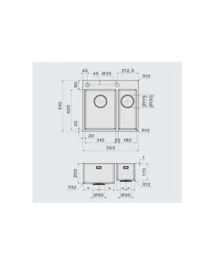 Мойка GARDA 31+18 CM INOX (2 чаши) (УСТАНОВКА НА СТОЛЕШНИЦУ ИЛИ В ОДИН УРОВЕНЬ)