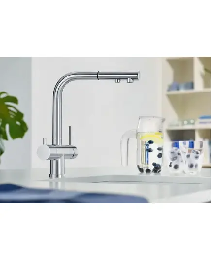 - • Удобный смеситель 3-в-1: фильтрованная и обычная вода из выдвижного излива