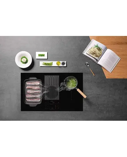 Варочная панель Elica NIKOLATESLA LIBRA BL/A/83 выполнена из чёрной стеклокерамики. Она относится к типу индукционных, значит, нагревается посуда, а не поверхность. Индикация остаточного тепла подскажет, когда прикасаться к ней будет максимально безопасно без риска получить ожог. Ширина изделия — 83 см. Здесь расположены 4 конфорки и вытяжка между ними. Управляются они через сенсорное слайдерное меню touch control. Таймер имеет две функции. Звуковое оповещение EggTimer (чаще всего используется для варки яиц) и отключение по времени.