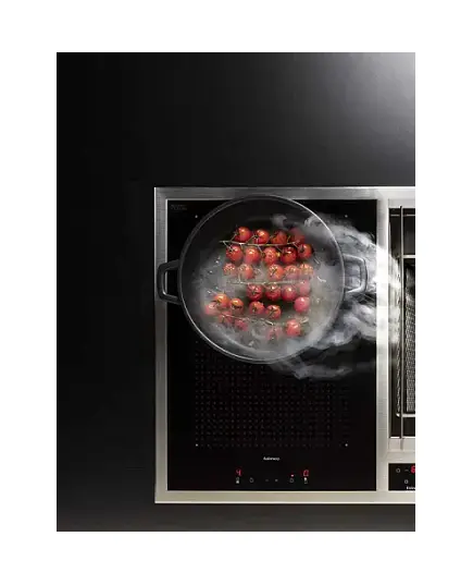 Варочная панель FALMEC Design+ MODULA/M2 (84×51) монтируется в столешницу. Она относится к индукционному типу и оборудована встроенной вытяжкой. Фильтрующая поверхность располагается в центре и работает в автоматическом режиме. Устройство само анализирует состав воздуха и определяет мощность всасывания. Оно может работать в режиме отвода и рециркуляции. В первом случае воздух выводится в вентиляцию, во втором — после очистки возвращается назад в комнату. Имеется индикатор, который сообщит вам о том, что фильтры пора почистить или заменить.