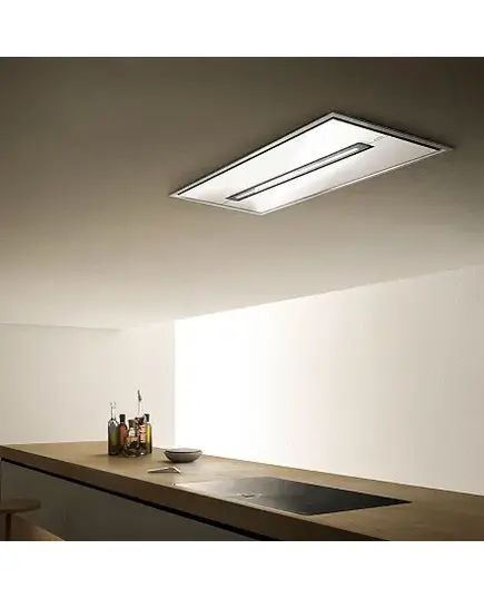 Дизайн. Встраиваемая вытяжка ELICA CLOUD NINE WH/A/120 имеет увеличенную ширину 120 сантиметров и предназначена для монтажа в потолок. Простой геометрический дизайн в сочетании с белым стеклом делает модель универсальной для любого кухонного интерьера.