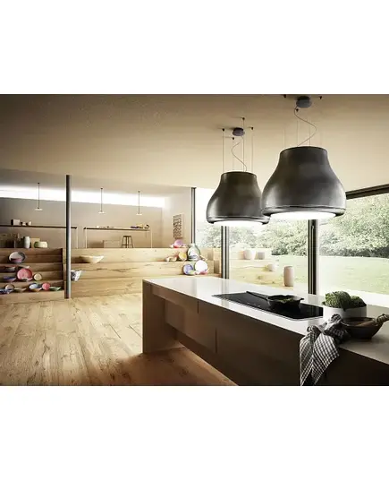 Дизайн. Подвесная вытяжка-люстра ELICA SHINING PELTROX/F/50 выполнена в цвете «состаренный графит». Дизайн можно совместить как с классическим, так и с современным интерьером в стиле хай-тек или лофт. На нижней кромке расположена панель управления, все функции которой также включаются с пульта ДУ. Потолочный монтаж позволяет повесить вытяжку над кухонным островом, но также существует возможность установить модель и на стену.