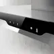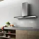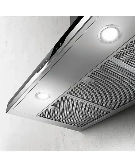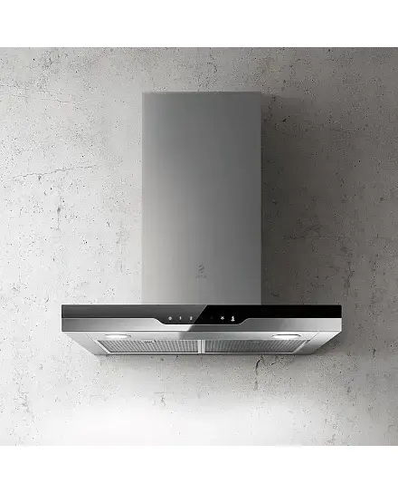 Дизайн. Вытяжка ELICA TOP SENSE IXBL/F/90 выполнена в цвете «нержавеющая сталь», фасад дополнен панелью из черного стекла с сенсорными переключателями функций.