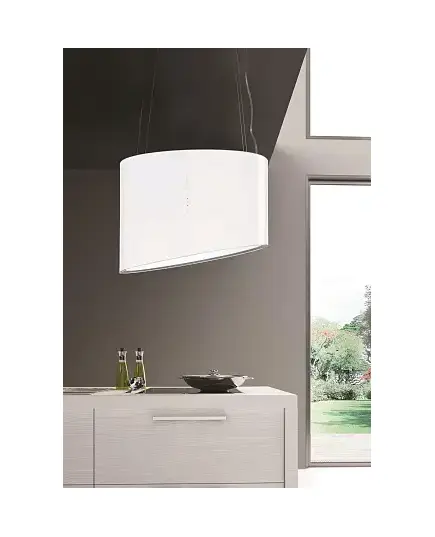 Вытяжка Falmec E.ion SPRING isola 80 vetro bianco (600) подвешивается к потолку с помощью стальных тросов. Корпус изготовлен из белого закаленного стекла. Он выглядит стильно и современно и будет замечательно смотреться в кухне дизайна хай-тек, в которой большая часть мебели и бытовой техники имеет белый цвет.