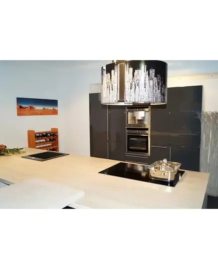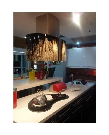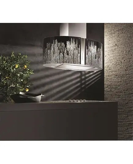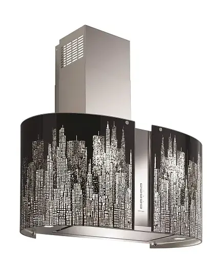 Дизайн. Островная вытяжка Falmec Mirabilia isola 85 MANHATTAN Vetro (800) ECP изготовлена из высококачественной нержавеющей стали и декорирована стеклянным колпаком Manhattan. Оформление кнопок управления органично дополняет дизайн в стиле хай-тек.